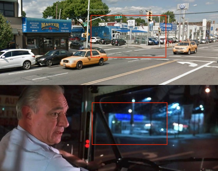 Since discovering production was using the Bronx to double for Brooklyn-Queens, my research partner Blakeslee took a stab at this scene, guessing that it too was filmed up there. He basically looked in the same neighborhood as the BQE scene, trying to find a street layout that matched the film — namely one that created a large triangle. (See the first “before/after” image above to get a good sense of this shape.) Fortunately, this location wasn’t too far from the BQE location, and he was abe to find it within an hour or so.