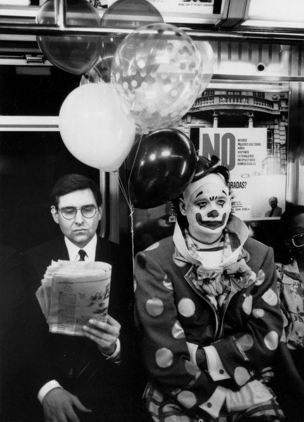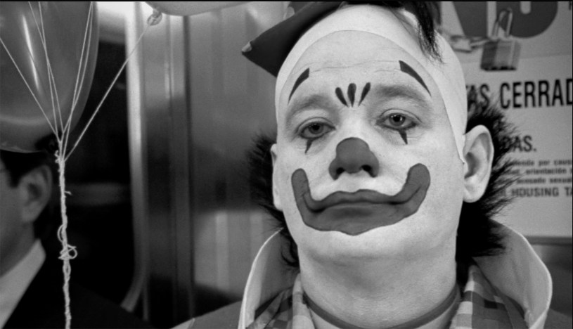 Dressed up in full clown costume and make-up, Grimm fights his way off the subway at track 4 of the 42nd Street-Times Square Shuttle Station.