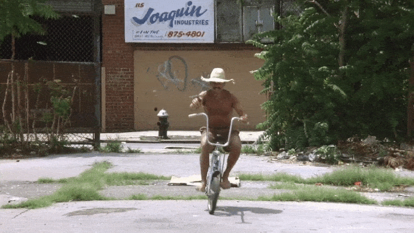 Ignoring Loomis, the shirtless man clutches a hoe and begins cycling into the nearby parking lot.