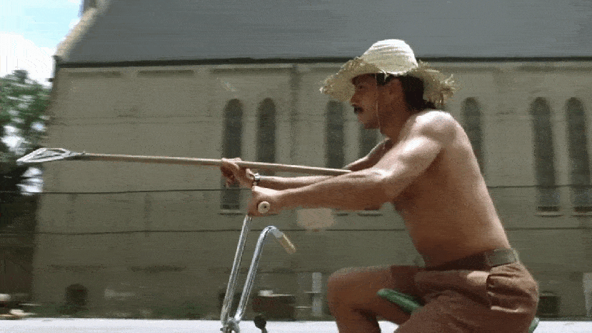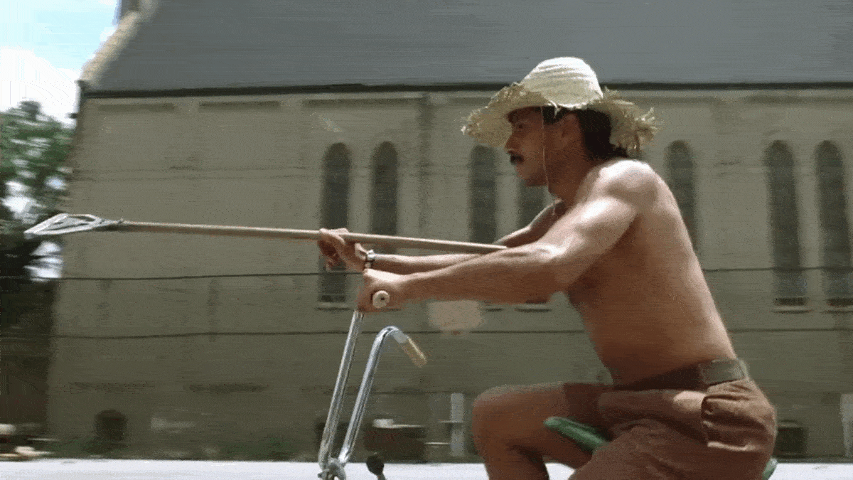 He successfully knocks the first guy off his bicycle, which inspires cheers and gasps from the crowd in front of the church.