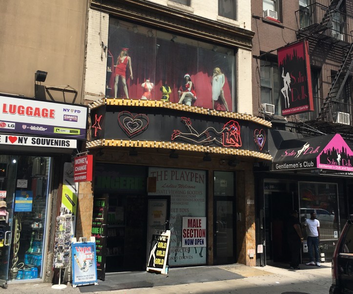 But there are still a few remnants of the old gritty Times Square around, including an adult shop called the Playpen at 687 Eighth Avenue. Originally located inside a theater a few blocks up, the Playpen moved to its current location in 2007 when the theater was demolished and replaced with a Shake Shack.