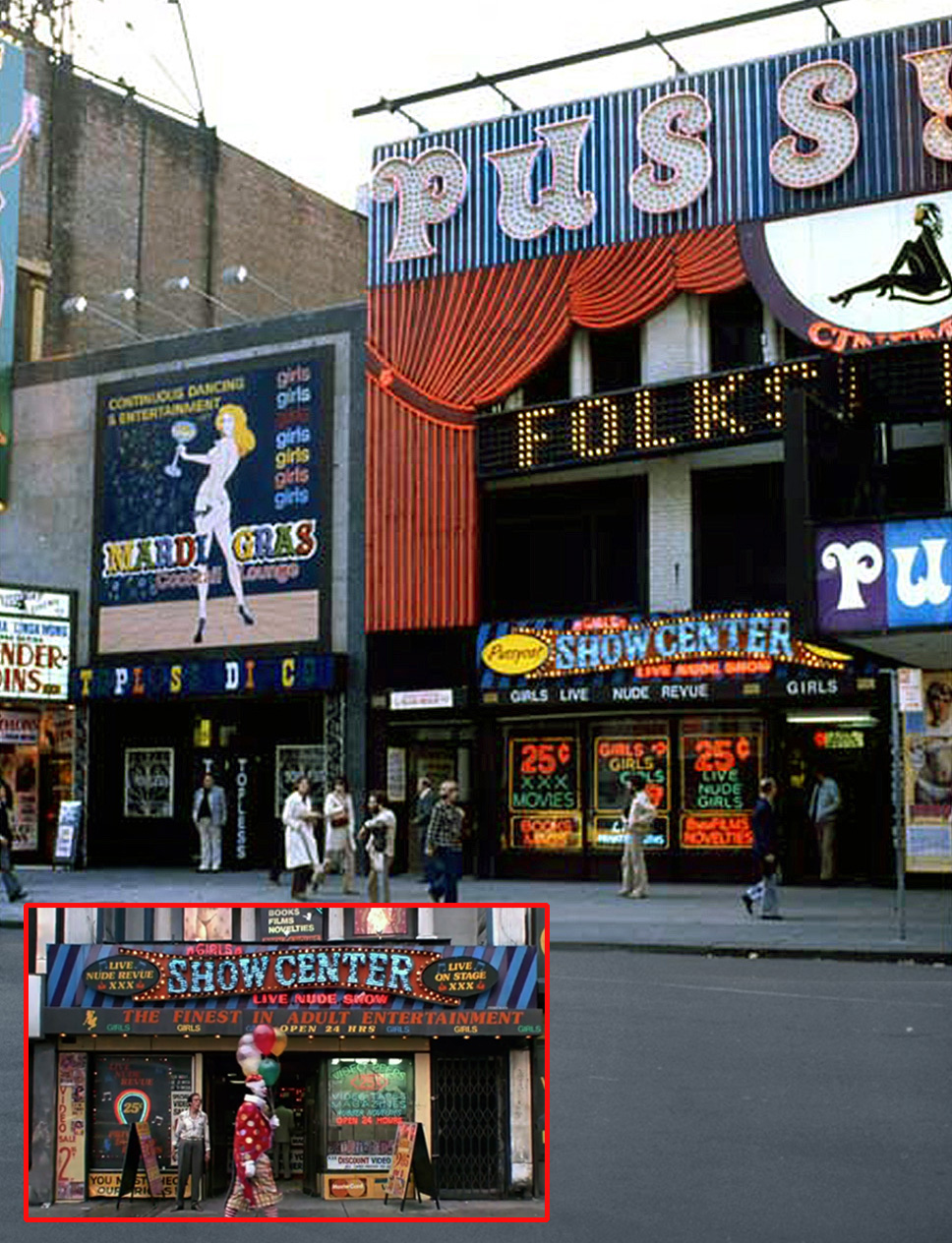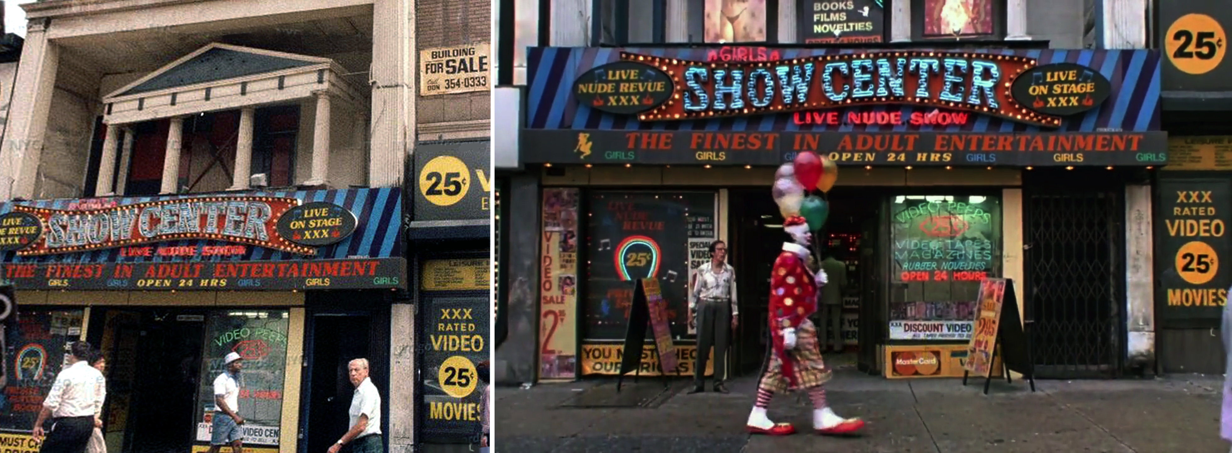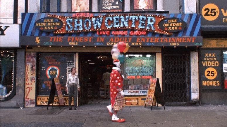 Grimm walks past the Show Center nude revue at 259 W 42nd Street, where the barker exclaims, “Clowns welcome!”