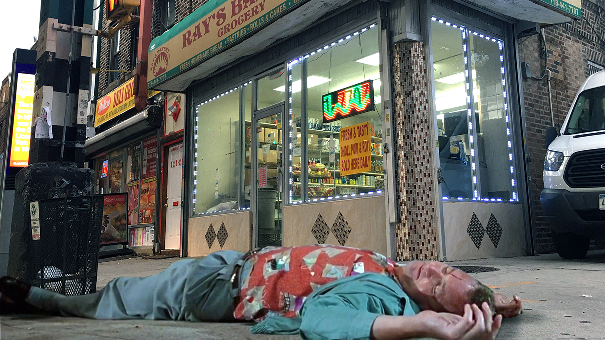 Needing exact change for the bus, Grimm rushes into the deli at 123-23 Jamaica Avenue to break a bill.