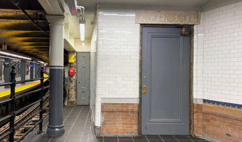 A modern view of the east end of the old Track 1 platform, which still has the entrance to the former Knickerbocker Hotel, along with the narrow maintenance door to the left.