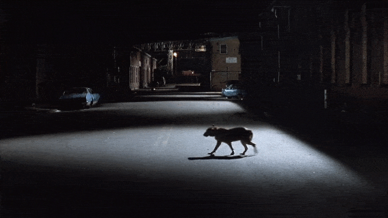 A feral dog scampers across Morris Avenue, adding to the eerie mood.