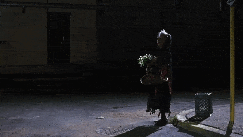 They then hear an old woman bellow out, “flowers for the dead” in Spanish.