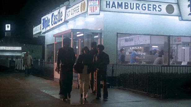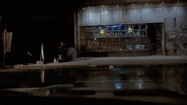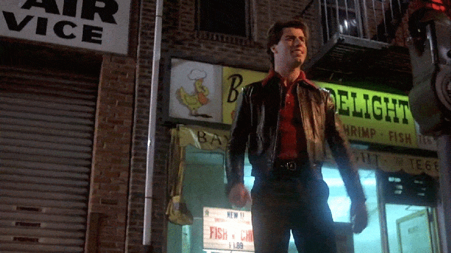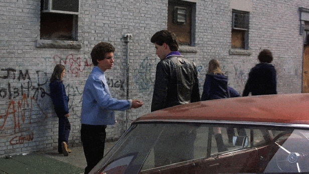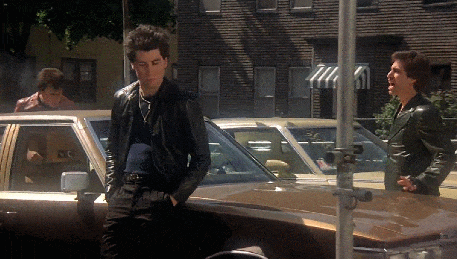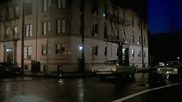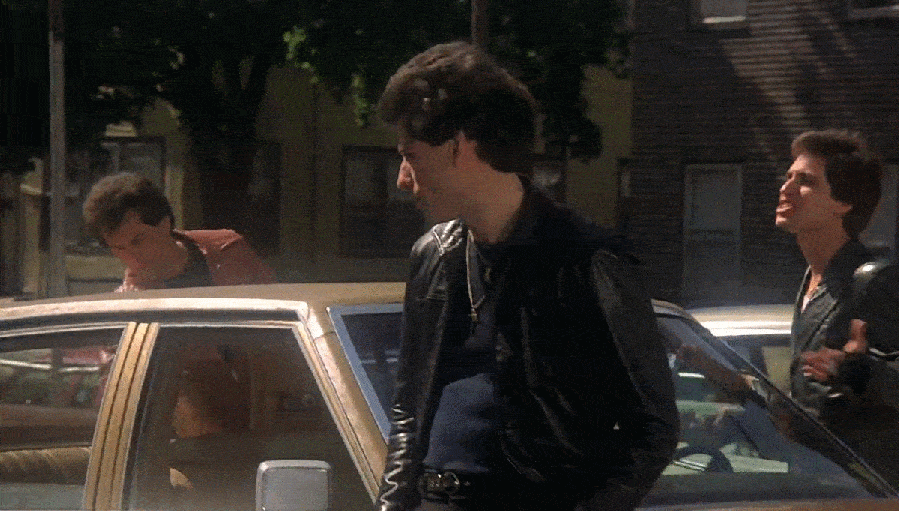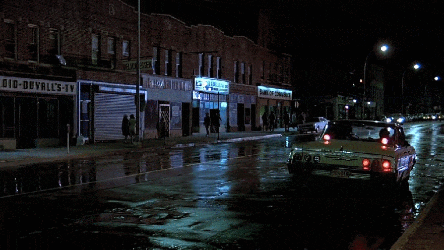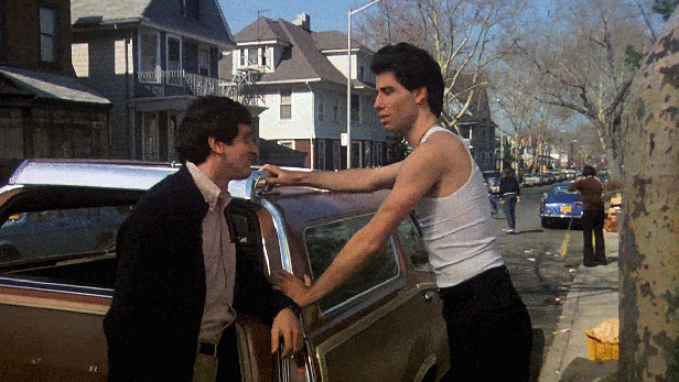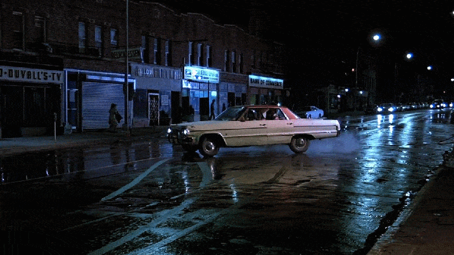 The gang’s car that’s featured in this and several other scenes was a 1964 Chevy Impala hardtop, which was personally picked out by director John Badham. He was subsequently told by a few locals that someone from Bensonhurst would never be caught dead driving a Chevy and would more likely drive an old Cadillac. But production had already spent a good chunk of money on two Impalas and getting them distressed, so they were stuck with they got.
