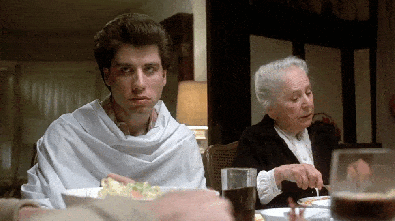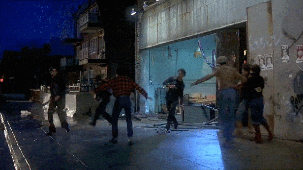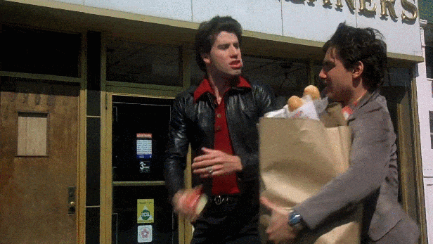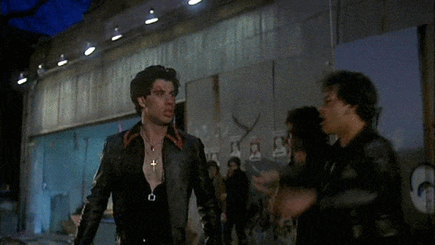 But apparently, Travolta didn’t want to do that. He thought it was important for the character to be standing up, and Badham reluctantly acquiesced. So that’s why in the scene, Tony is upright, while Double J is on his hands and knees. Fortunately no one was harmed in the making of this scene.