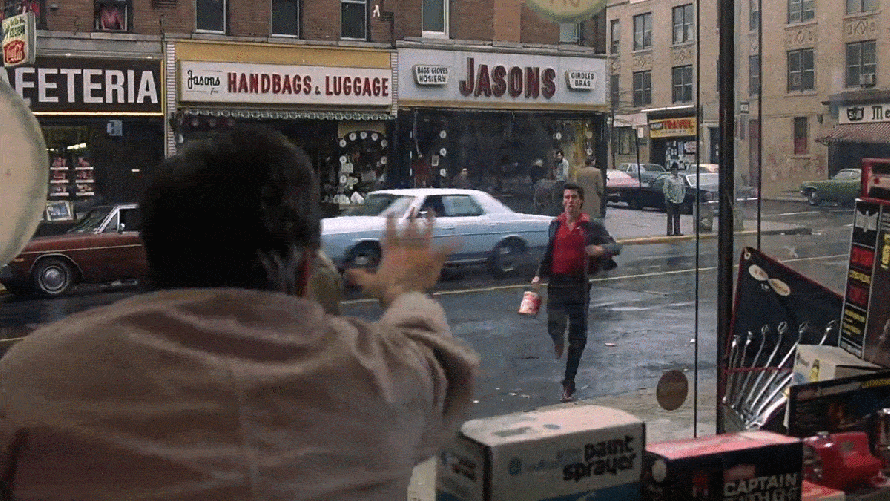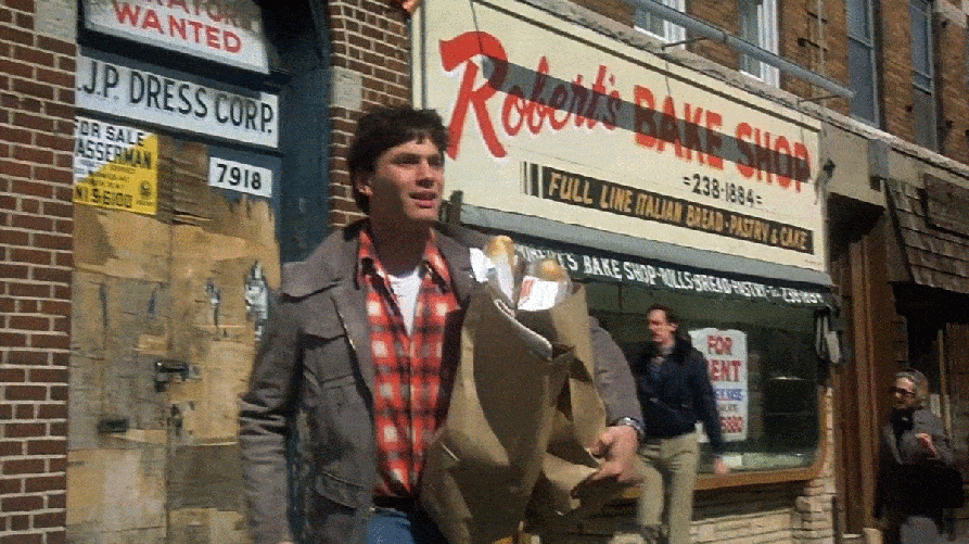 After Tony gets some pizza slices and passes Reflection 1 again, the next shot is a close-up of him carrying the paint can. I figured out this location after spotting a phone number on a door in the background which I discovered was for a Basile Realty Group at 8520 20th Avenue. (It’s basically the same location used for the first close-up shot of Tony’s shoes).