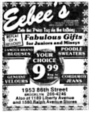 As far as I can tell, Eebee’s was a chain of your typical discount clothing stores that were ubiquitous in NYC during this period. They were the kind of place that when you walked in, your nostrils would flare from the sharp synthetic odor coming from all the cheap imported garments.