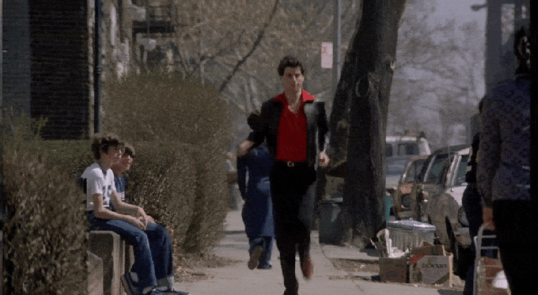 One thing that helps make this sequence so memorable is the upbeat music, and while most people associate Saturday Night Fever‘s soundtrack with the Bee Gees, apparently during the film’s production, the only Bee Gees’ song they had secured was a demo version of “Stayin’ Alive.”