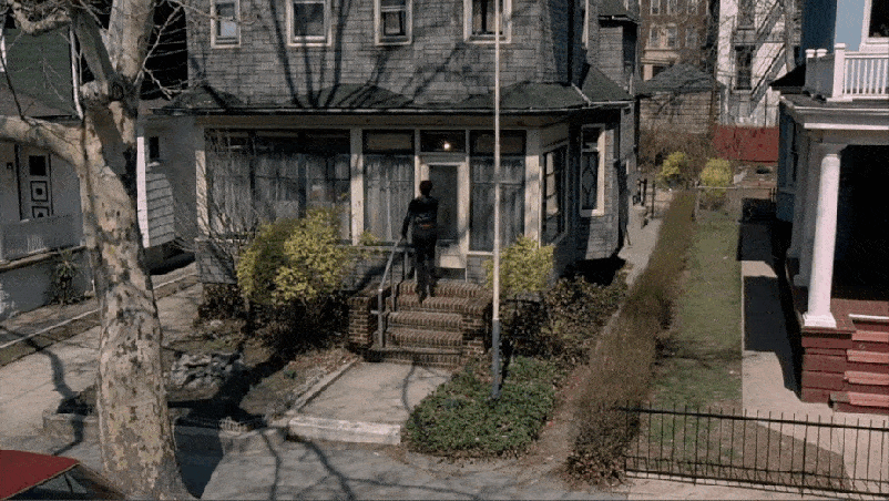 Not much research was needed in figuring out the location of this quick scene since it starts at the same place where Tony gets picked up by his friends earlier in the movie. And with several building numbers clearly visible in the background during this single tracking shot, it was easy to figure out exactly where the scene ends.