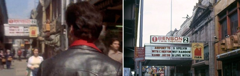 By the early 1970s, as the theatergoing market started changing, the Benson tried its hand as a porno house. Then, after the theater was split into two screens in 1975, it was renamed Benson Twins and they started showing mainstream movies on one screen and x-rated movies on the other (which I’m sure made for some interesting mingling at the concession stand). However, that didn’t last long and by the time Saturday Night Fever was being filmed, the theater switched back to showing just straight films.
