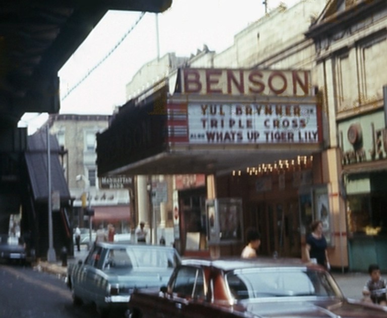 During the next decade, the Benson Theatre was closed more than it was open, and in 1988 it finally closed its doors permanently, but the building itself is still around and currently houses a Rite-Aid drugstore. (You can see some of the theatre’s original ornamentation near the top of the building in the second-to-last “before/after” image above.)