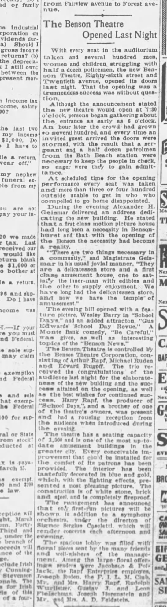 The Benson, a 1,500 seat theater named after the Brooklyn neighborhood it resided in, first opened in 1922 with the comedy/drama, School Days. On that opening night, it was reported that the crowd was so riotous (supposedly storming the theater doors in hopes of securing a seat) that police were called in to keep things in check.