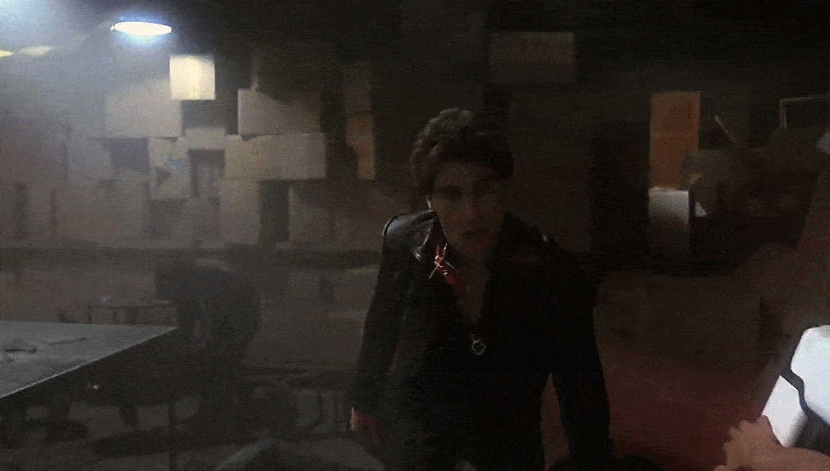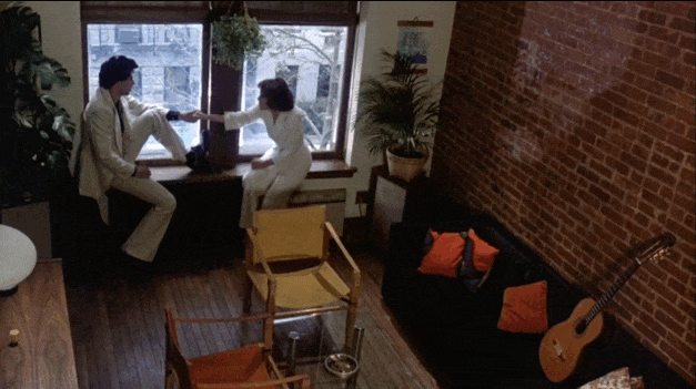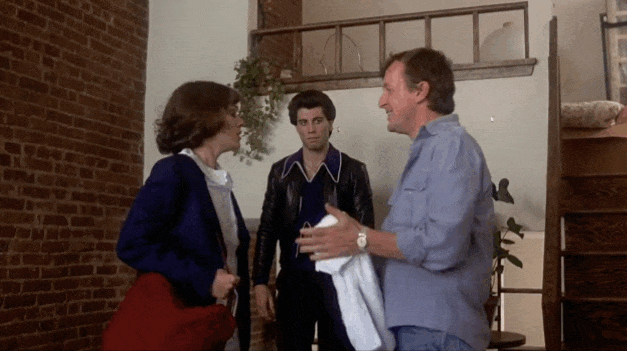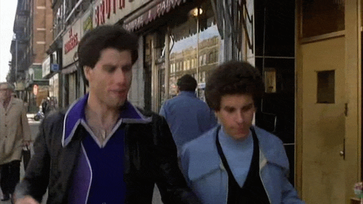 But apparently, Travolta didn’t want to do that. He thought it was important for the character to be standing up, and Badham reluctantly acquiesced. So that’s why in the scene, Tony is upright, while Double J is on his hands and knees. Fortunately no one was harmed in the making of this scene.