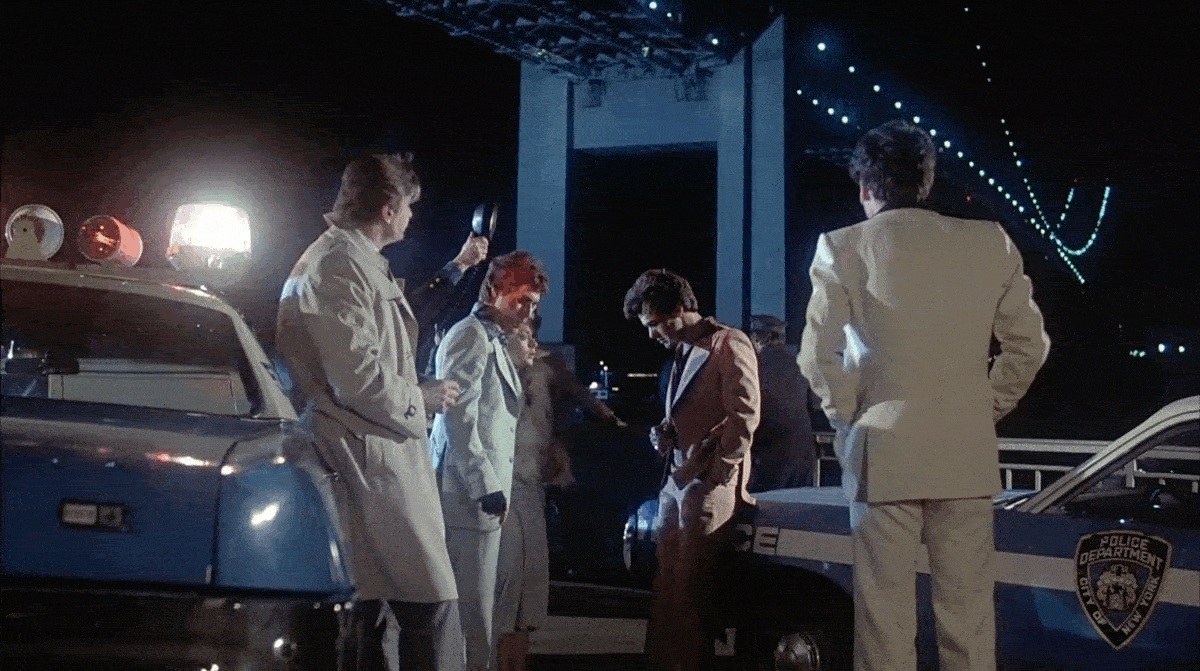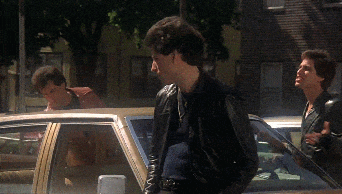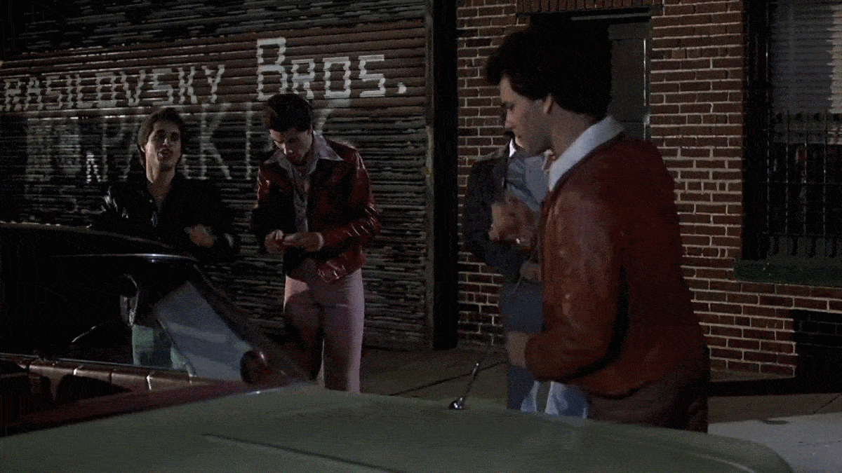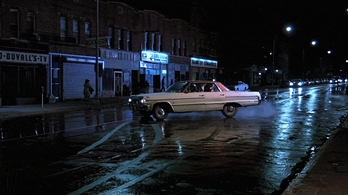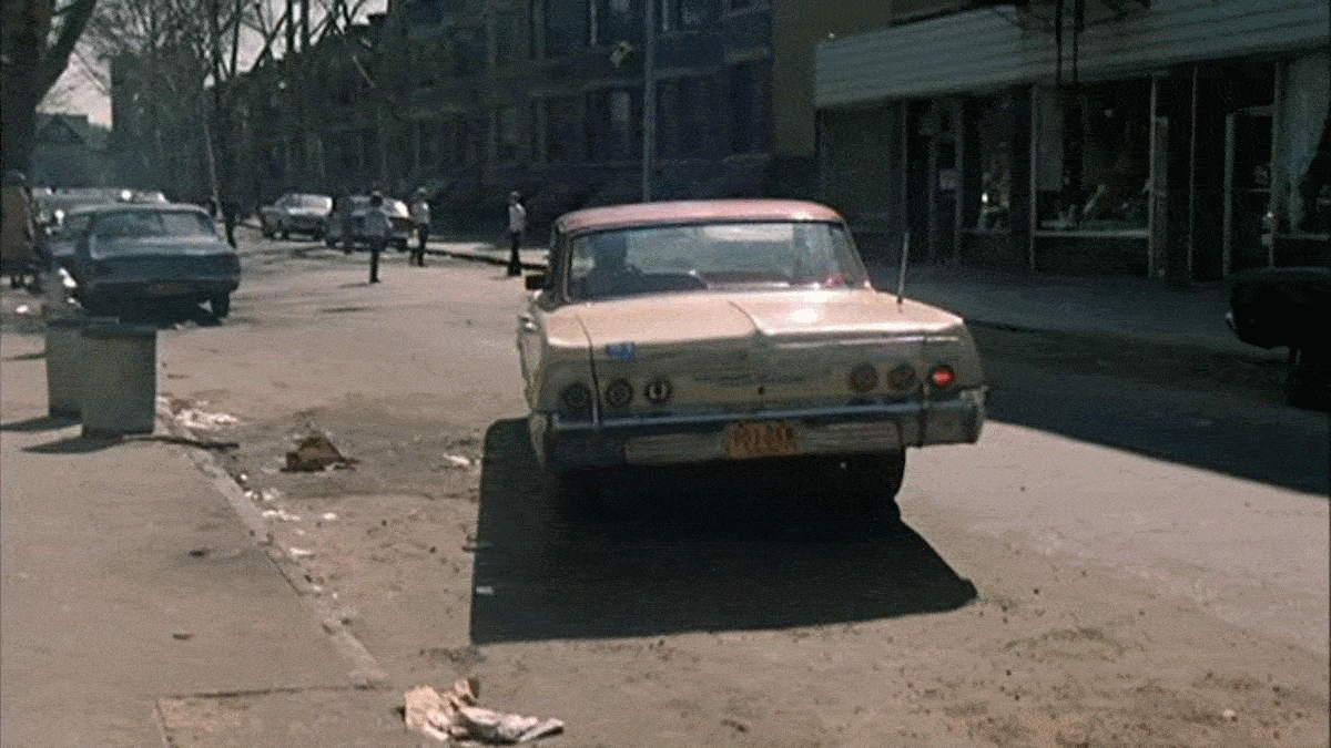 The gang’s car that’s featured in this and several other scenes was a 1964 Chevy Impala hardtop, which was personally picked out by director John Badham. He was subsequently told by a few locals that someone from Bensonhurst would never be caught dead driving a Chevy and would more likely drive an old Cadillac. But production had already spent a good chunk of money on two Impalas and getting them distressed, so they were stuck with they got.