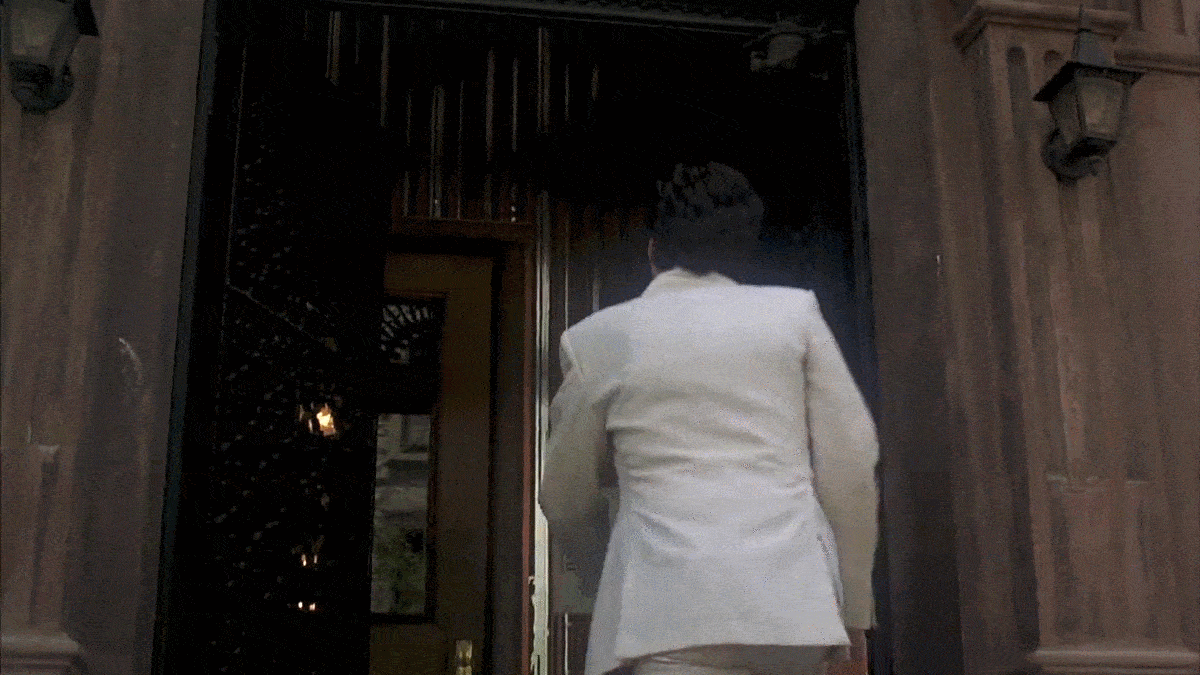 Not much research was needed in figuring out the location of this quick scene since it starts at the same place where Tony gets picked up by his friends earlier in the movie. And with several building numbers clearly visible in the background during this single tracking shot, it was easy to figure out exactly where the scene ends.