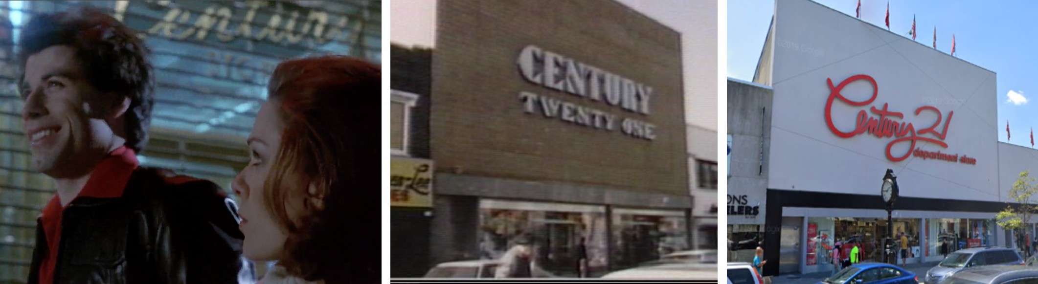 After figuring out where this scene started, I found a couple other clues that helped track the exact walking route the couple took. The most noticeable clue was a window they pass that said, “Century” on it. Since the window was part of what looked like a large department store, I surmised that it was a Century 21 — a chain of department stores operating primarily in the northeast. Turns out I was correct, and in fact, there was still a Century 21 at that location up until December, 2020.