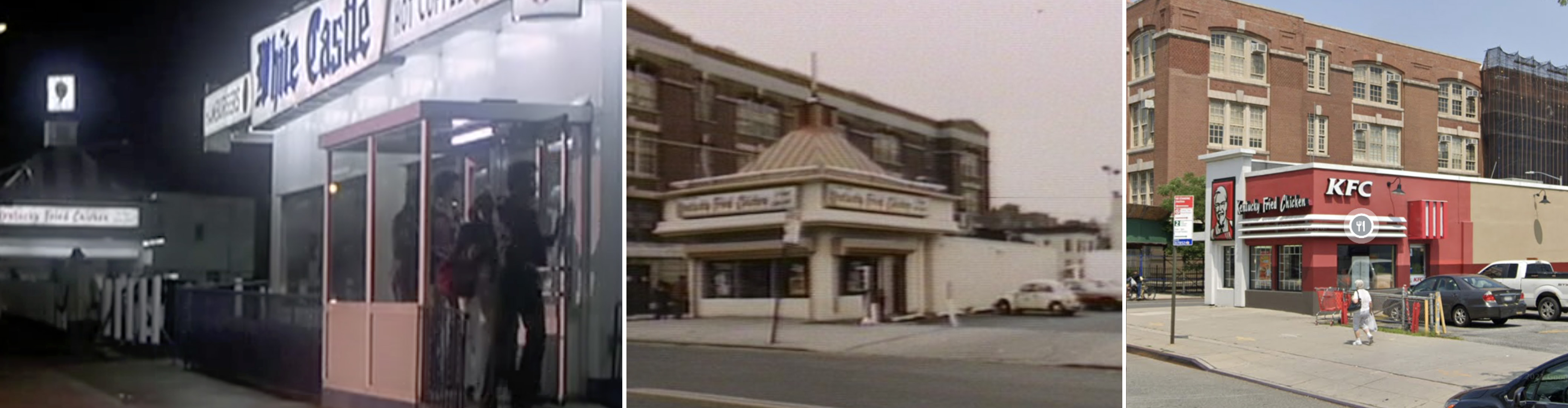 While there was a White Castle at 9201 4th Avenue, I wasn’t sure if it was the same one from the film, since the hamburger franchise had many locations in New York City. But then I noticed in the scene that you could see a Kentucky Fried Chicken down the street. And sure enough, there still is a KFC on the corner one block east from the old White Castle.