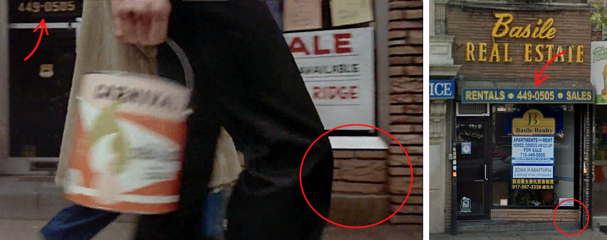 After Tony gets some pizza slices and passes Reflection 1 again, the next shot is a close-up of him carrying the paint can. I figured out this location after spotting a phone number on a door in the background which I discovered was for a Basile Realty Group at 8520 20th Avenue. (It’s basically the same location used for the first close-up shot of Tony’s shoes).