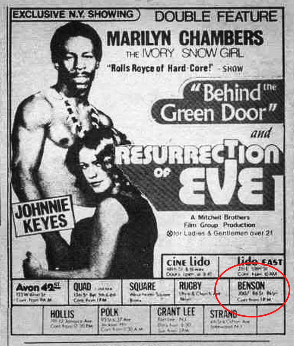 By the early 1970s, as the theatergoing market started changing, the Benson tried its hand as a porno house. Then, after the theater was split into two screens in 1975, it was renamed Benson Twins and they started showing mainstream movies on one screen and x-rated movies on the other (which I’m sure made for some interesting mingling at the concession stand). However, that didn’t last long and by the time Saturday Night Fever was being filmed, the theater switched back to showing just straight films.