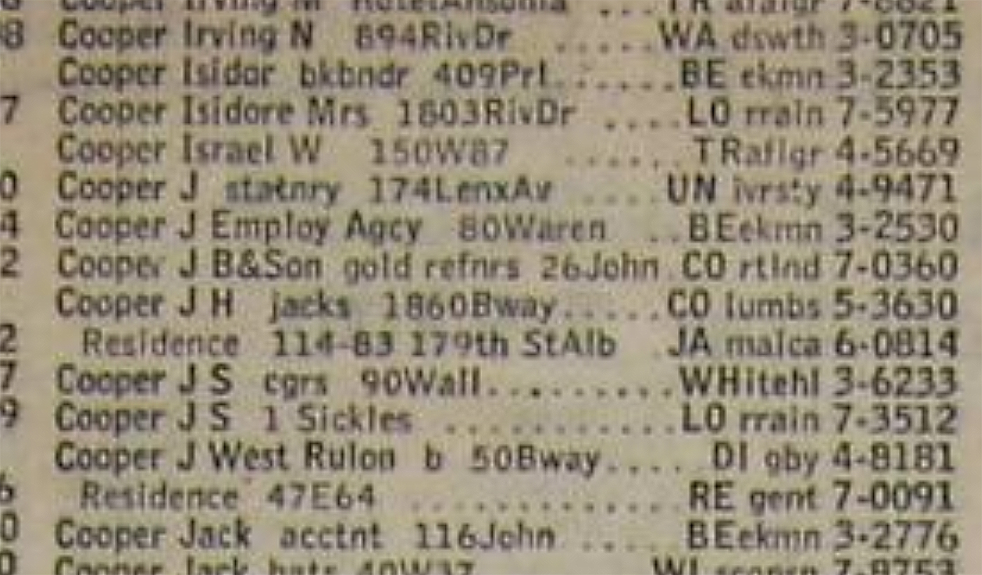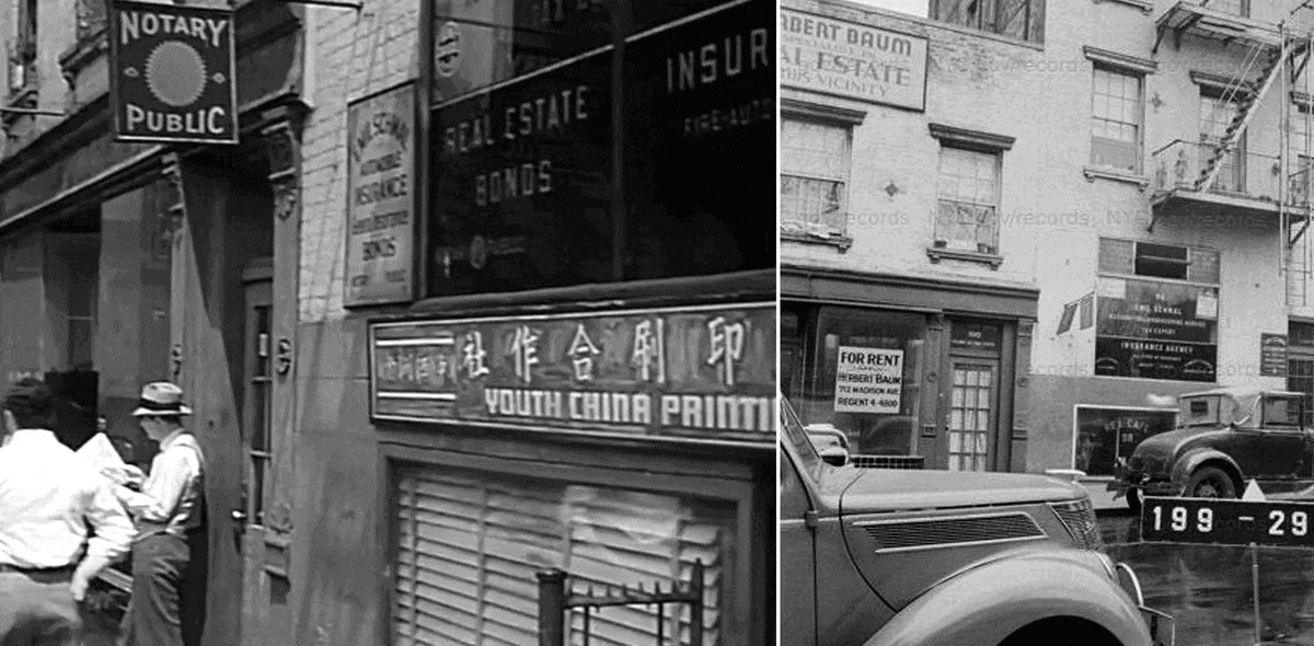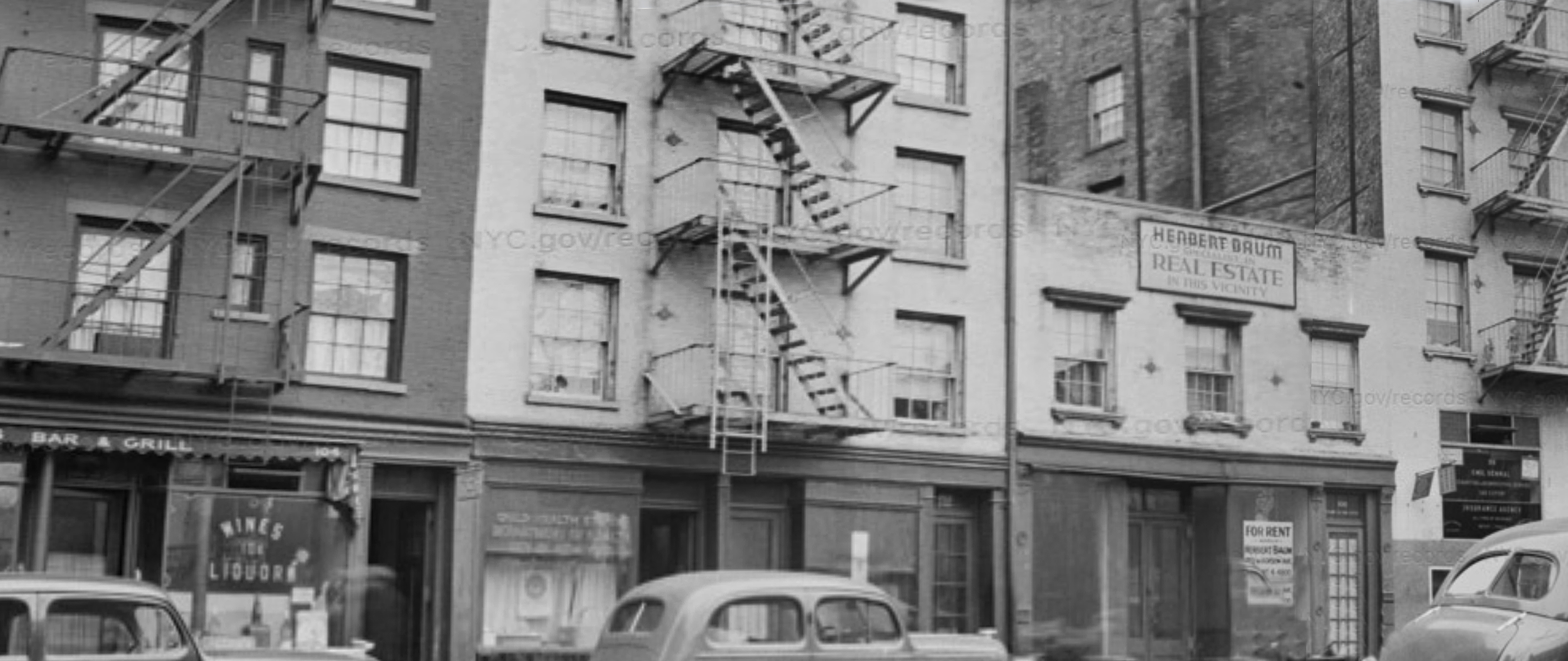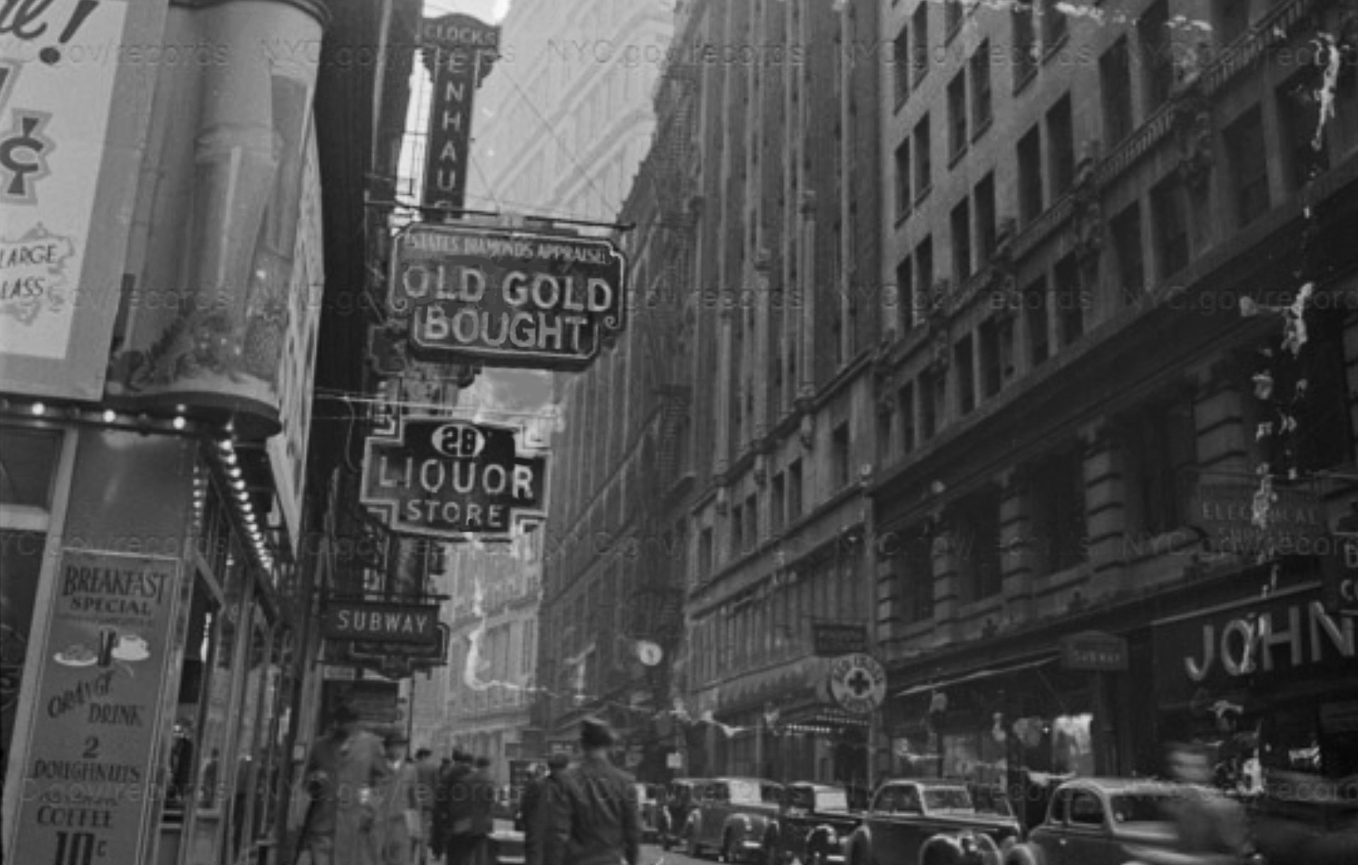The sign that was the most clear was a long vertical one for a metals dealer called, “Cooper & Son.” So, I checked out a phone directory from 1946 and eventually found a listing for a Joseph B Cooper & Son, gold refiners, with an address of 26 John Street (located just a few blocks north of Bowling Green). Then, after looking at a tax photo from c 1940, I found plenty of clearcut matches, confirming I got the correct spot.