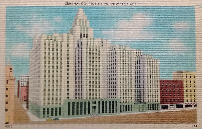 Completed in 1941, the Criminal Courts Building replaced the old 1894 Criminal Courthouse and the old Tombs prison on Centre Street in downtown Manhattan. One the architects of the seventeen-story modernist structure was Harvey Wiley Corbett, who also co-designed Rockefeller Center as well as the Metropolitan Life North Building (featured in the 1985 film, After Hours).