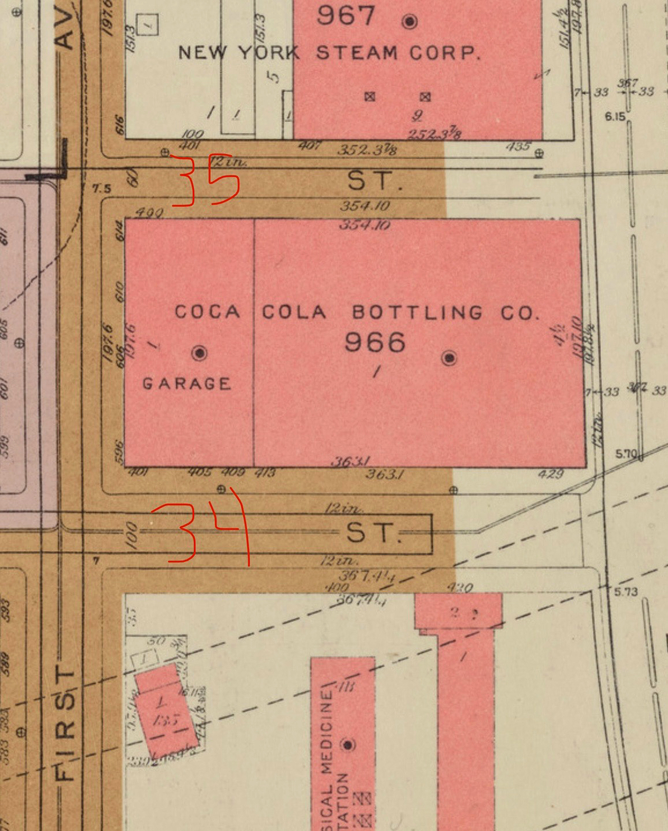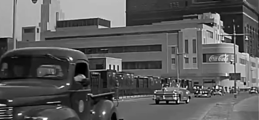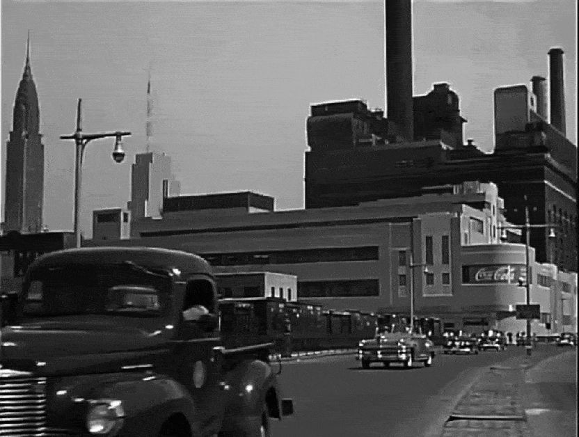 Looking for a little help, I showed the movie clip to my research partner, Blakeslee, who also was intrigued by that elusive building. The first thing he did was go to the 1955 Land Book (available on the NYPL website) and saw that there used to be a thing called, “Coca Cola Bottling Company” on that lot.