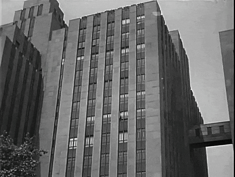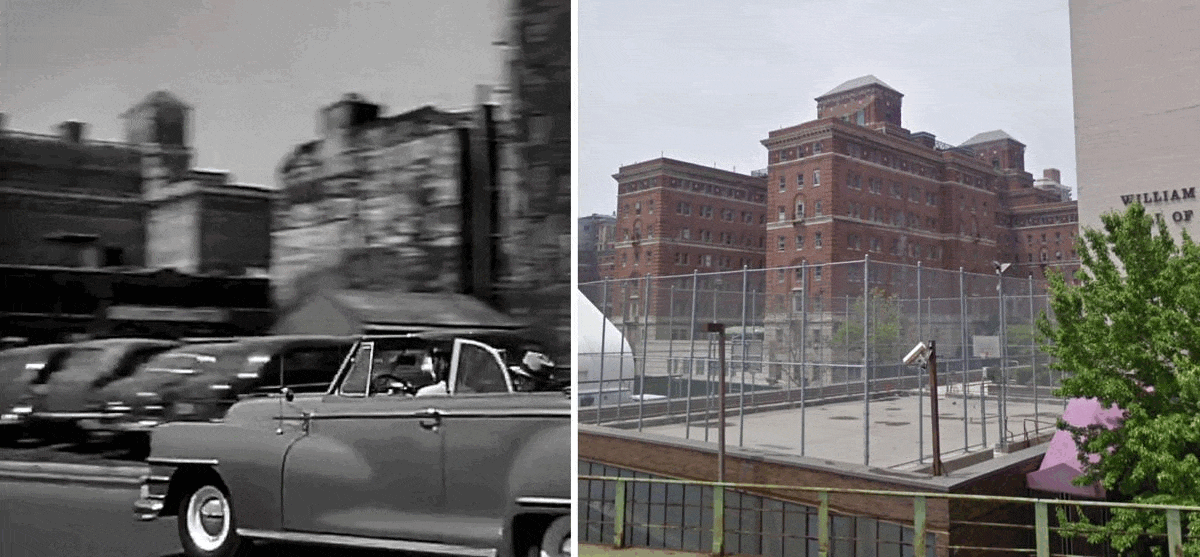 But the part I was most keen to find was the wide shot of the car driving by with Spencer Tracy and Katharine Hepburn’s body doubles, which was clearly filmed on location on FDR Drive. Fortunately, as the car drives by, the camera swings in the opposite direction, offering a clear view of Bellevue Hospital, located just south of E 29th Street.