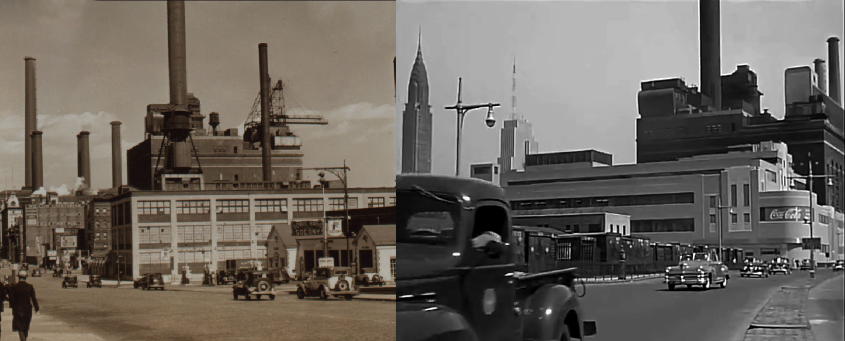 After I got a good fix on where the action took place, I was quickly able to identify the hulking power station with the tall chimneys to be an outlet for New York Steam Corp, a public utility dating back to 1882.