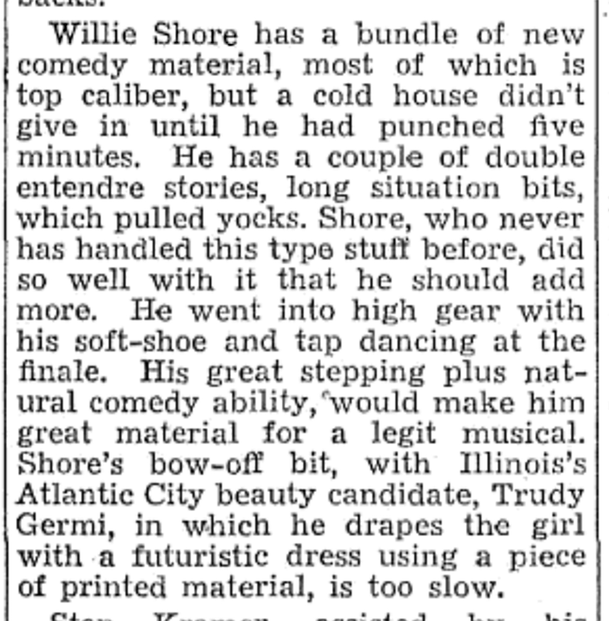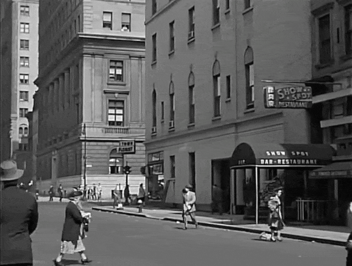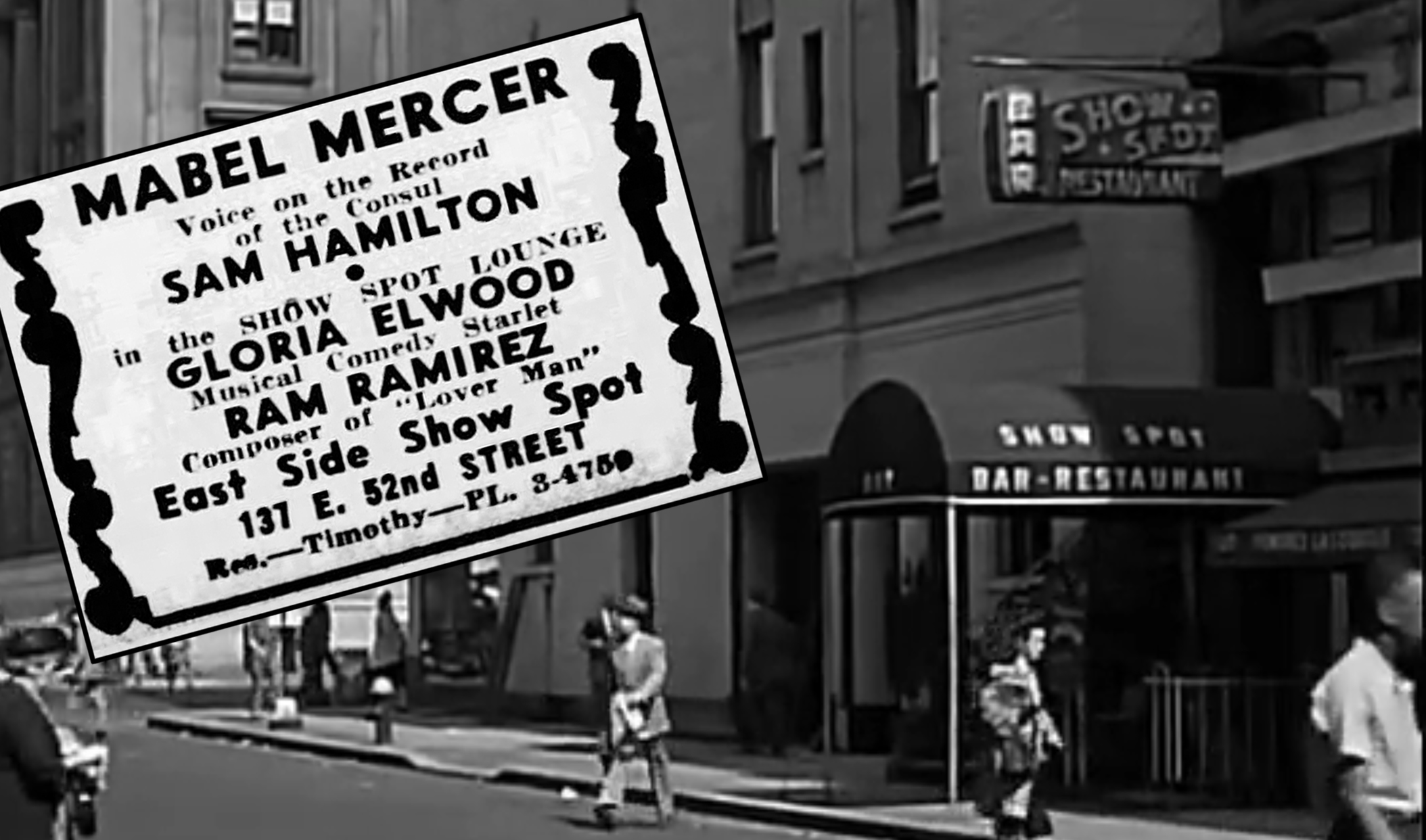 At the time this scene from Adam’s Rib was being shot, a regular headliner at Show Spot was the English-born cabaret singer, Mabel Mercer who performed upstairs in the Byline Room. A particular favorite of the gay community, Mercer continued her engagement there until the club closed in late 1953 after owner Willie Shore died in a collision with truck in Lexington, Illinois.