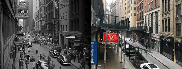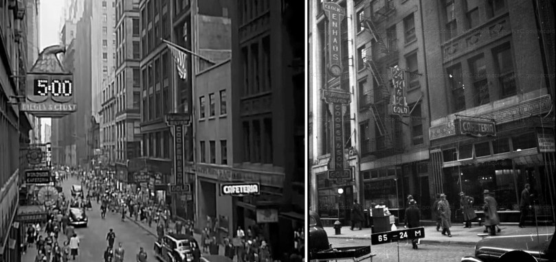 When it came to taking the modern pictures of John Street, it was a little difficult to match the high angle used in the film. To help raise the height of my camera, I used my super long, 118″ Selfie Stick, which got it close to the same angle, but still ended up being a little off.