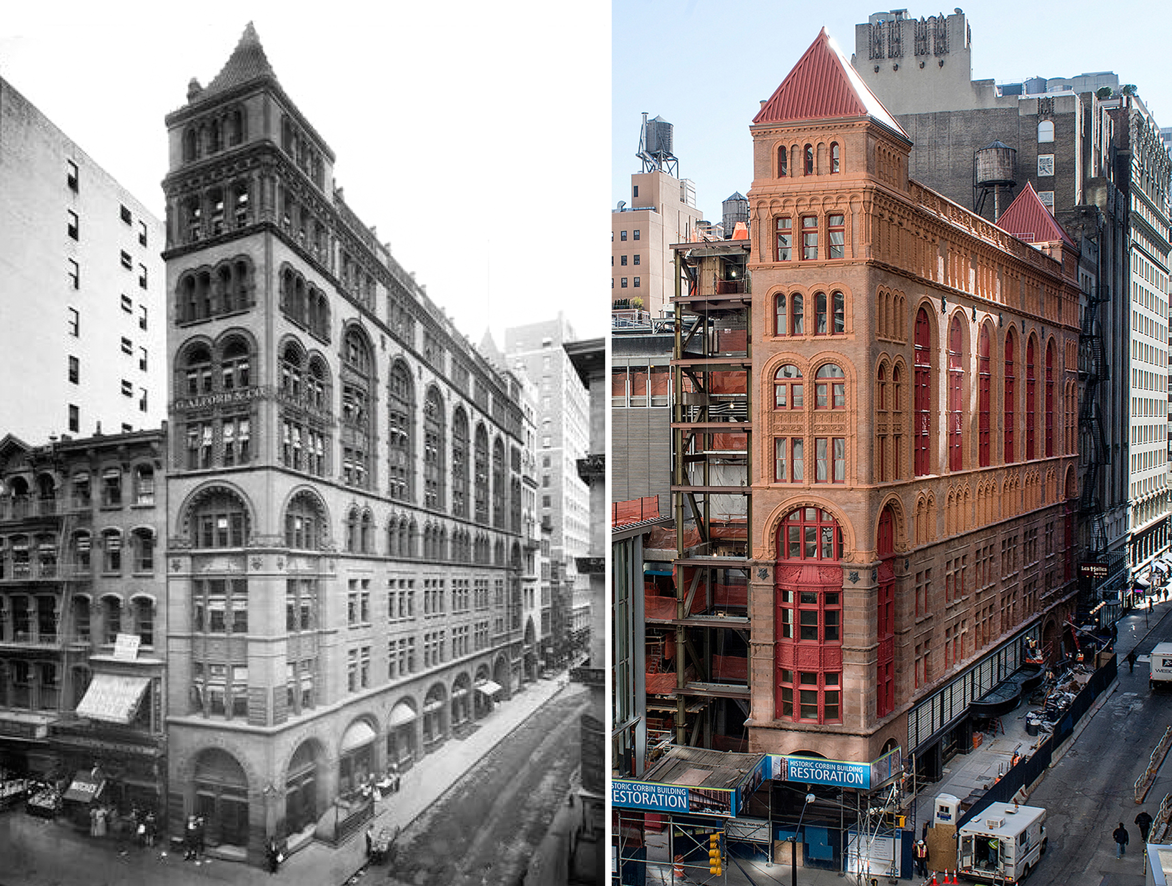 One of the great architectural gems (pun intended) in the Jewelry District was the Corbin Building, located on the northeast corner of Broadway and John Street. The slender, nine-story building was designed in 1888 by Francis H. Kimball —a pioneer in early commercial skyscrapers— and towered over its modest neighbors that peaked at five-stories. Originally constructed as the headquarters for the Corbin Banking Company, by the 1930s, the terra cotta-embellished building was owned by the Collegiate Reformed Dutch Church. In 1937, the Times reported that the church had leased the entire building to Herman A. Groen, a wholesale jeweler, making it the focal point of the district.