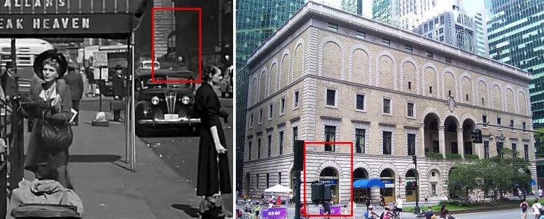But back on E 52nd Street, you can see from the “before/after” images above that the area has changed dramatically since the days of Adam’s Rib. The only surviving building from the scene is the Racquet and Tennis Club at 370 Park Avenue, which appears in the far distance as the characters are approaching the apartment building.