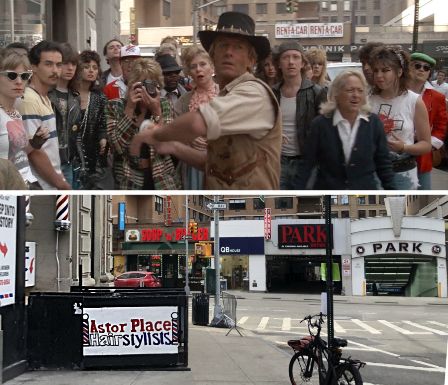 A good chunk of Crocodile Dundee’s New York scenes have easily-identifiable locations, starting with this one. This is mostly thanks to the presence of the distinct New York Public Library Main Branch on Fifth (whose exterior facade and plaza are sparkling clean in the scene after receiving a major renovation about a year prior.)