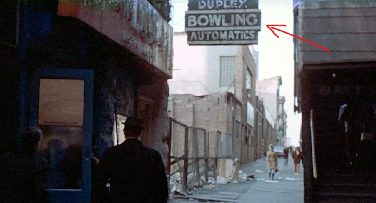 This misconception of the stair placement caused a lot of the problems in figuring out the filming location. But the most valuable clue was the sign above the bar, which seemed to say Duplex Bowling
