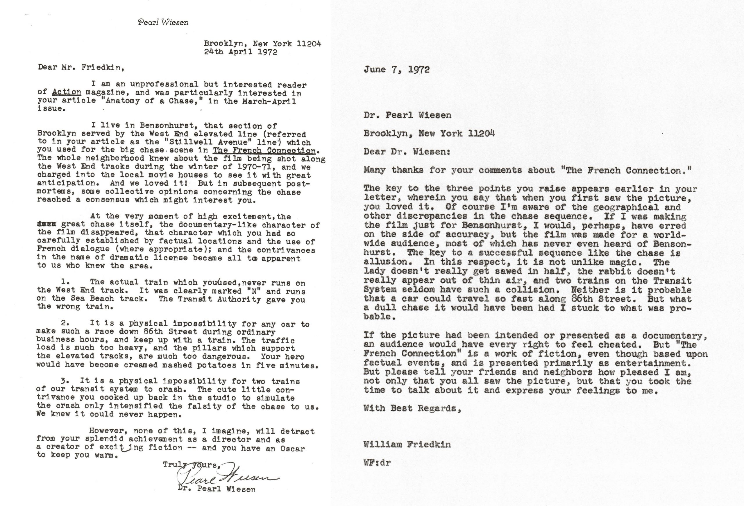 After the movie was released in theaters in October of ’71, this chase sequence was obviously a thrilling highlight for moviegoers. But that still didn’t stop a few sticklers from pointing out some of the errors and inconsistencies. Below is one of those letters and director Friedkin’s response. (Click to enlarge.)