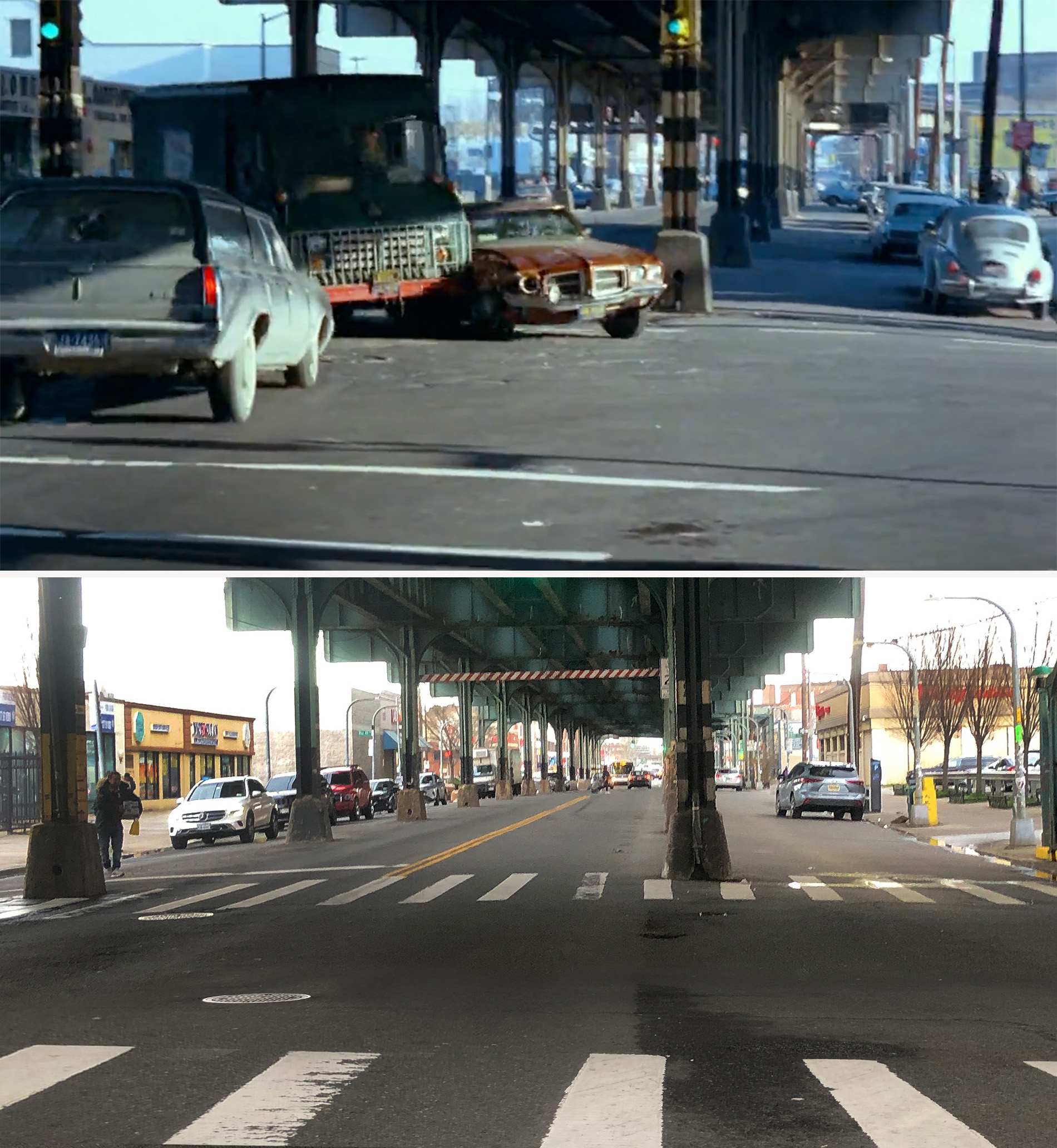 While a portion of the neighborhood is middle- and upper-class, it’s primarily made up of working-class people, so there’s been less of a push by developers to upgrade the retail/residential buildings along the El tracks. Consequently, much of the street looks like how it was back in the seventies. (It might be noted that the same tracks were featured in the opening sequence to another 1970s classic, Saturday Night Fever.)
