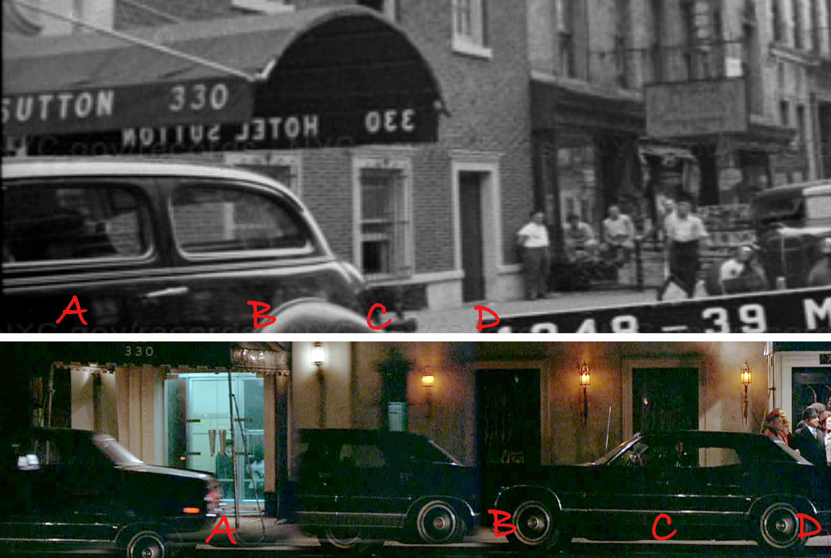 It was a little hard to see, but I did find similarities when I compared the tax photo of 330 E 56th to a composition I made from the movie. The most striking correlation was both of them had a main entrance with an awning, followed by two windows and another entrance.