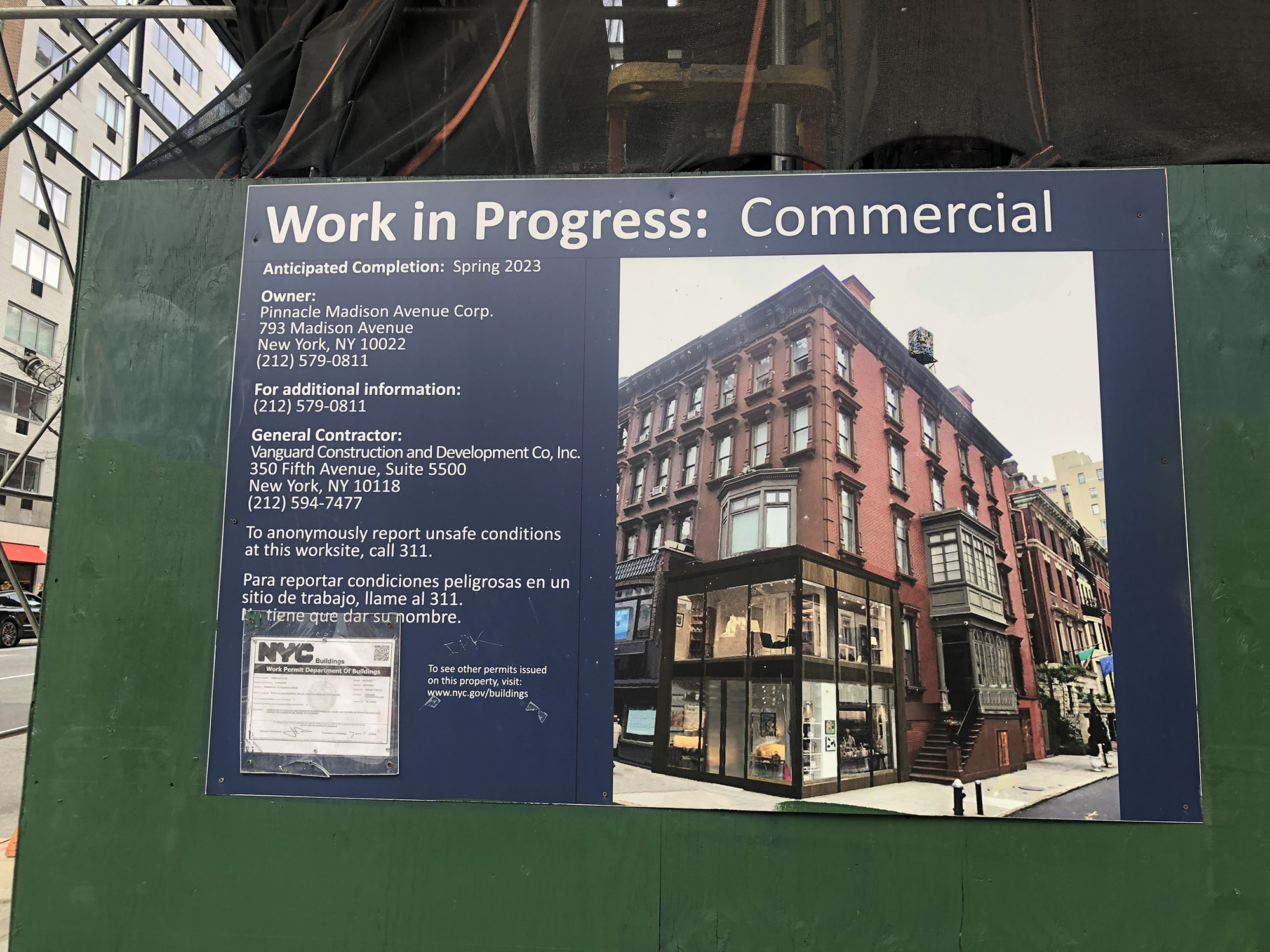 I can’t tell you how dismayed I was when I discovered the lower shop on E 67th street was covered in sidewalk sheds. The bad news: all that plywood and steel piping mucked up my modern photos. But the good news: it appears the building is only being repaired and isn’t slated for demolition.