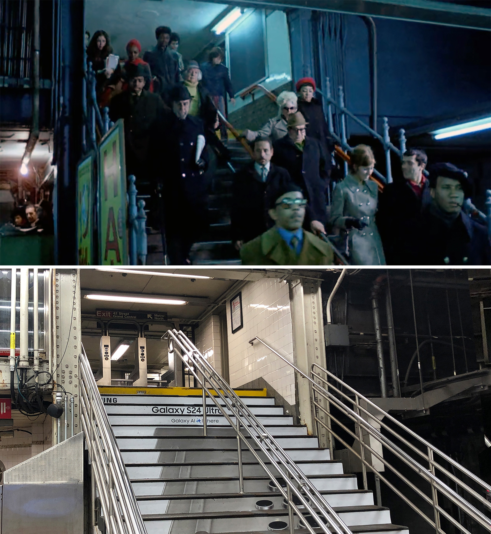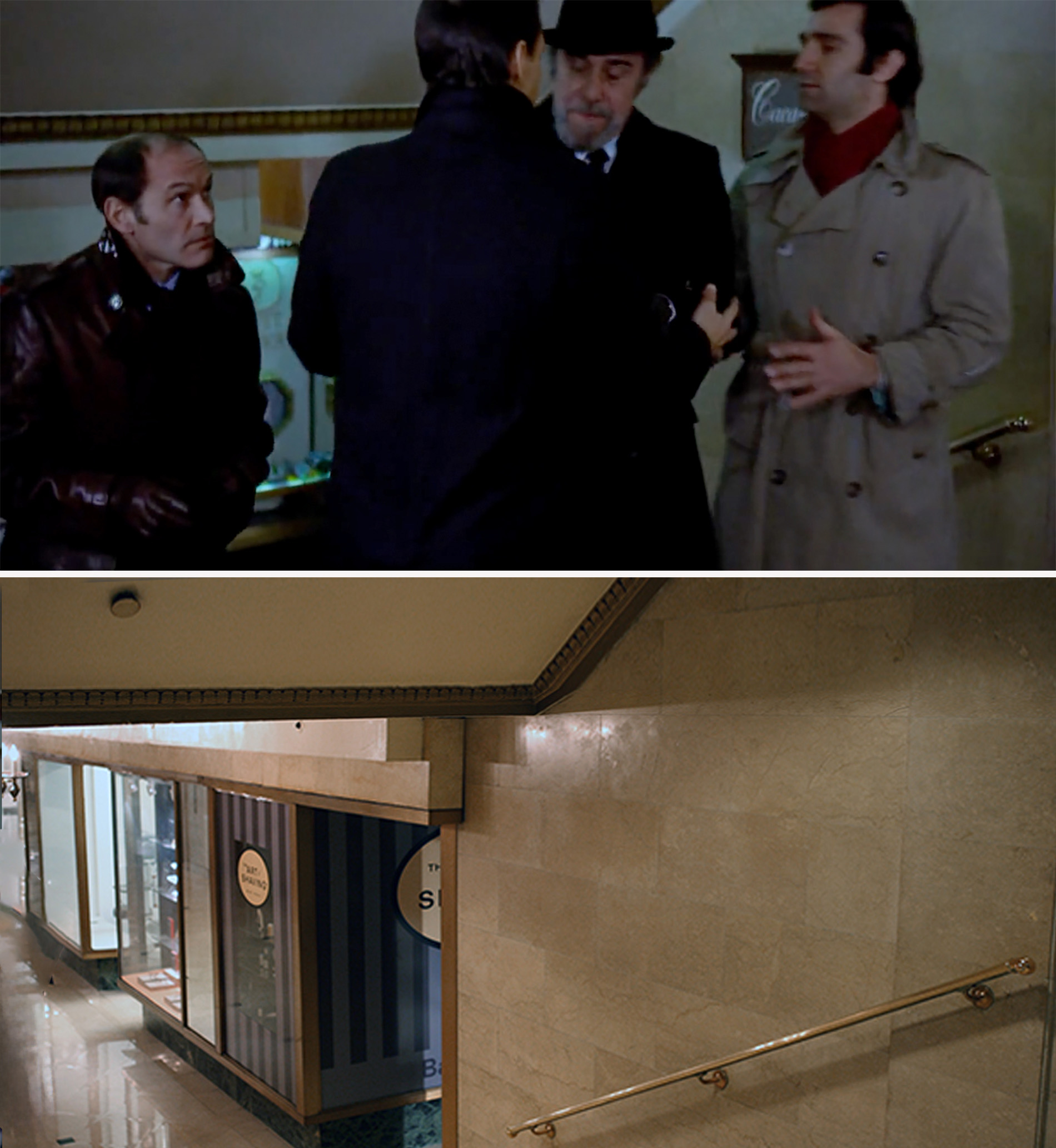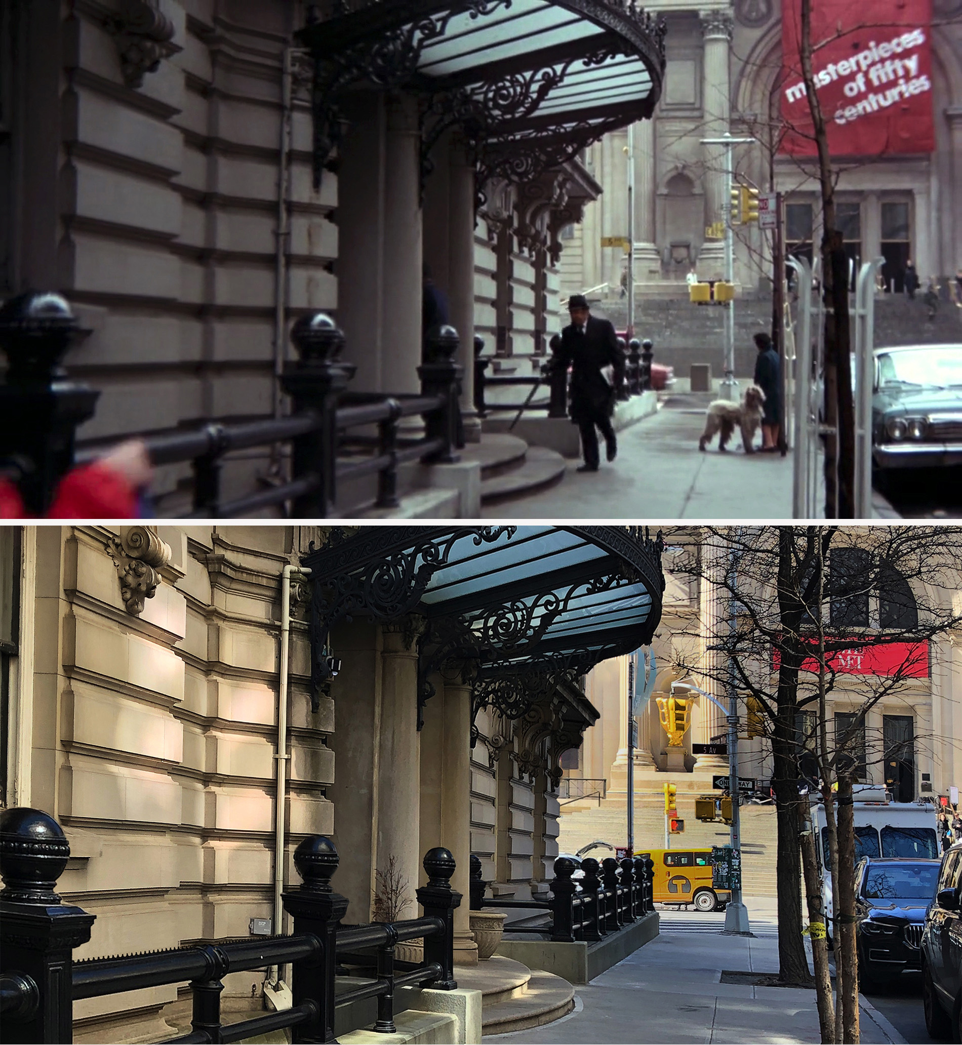 I don’t know the date of when they filmed these brief scenes, but it had to be sometime after November 14, 1970, as that’s when the “‘Masterpieces of Fifty Centuries” show began at the Met. (Its big red banner can be seen in the third “then/now” image above.)